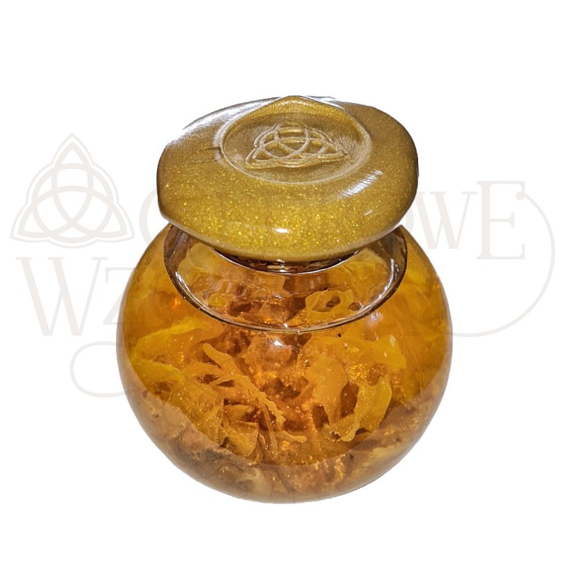 Przebieg: Rytuał rozpoczynamy od psychicznego nastawienia. Możemy wziąć kąpiel i przygotować się mentalnie. Weź butle w ręce, potrząśnij nią, spójrz jak małe, złote drobiny wirują w butli. Zwizualizuj, że podobnie jak drobiny kumulują się ostatecznie na dnie, tak przyciągasz do siebie i swego domu wszelkie dobrodziejstwa, dostatek i pieniądze. Ustaw butlę na najbardziej nasłonecznionym oknie w domu. Idealnym miejscem będzie kuchnia. Rytuał zakończony. Ważne! Co pewien czas (a nawet codziennie) wstrząsaj butlą i wizualizuj kilka sekund cel kumulacji i dostatku!